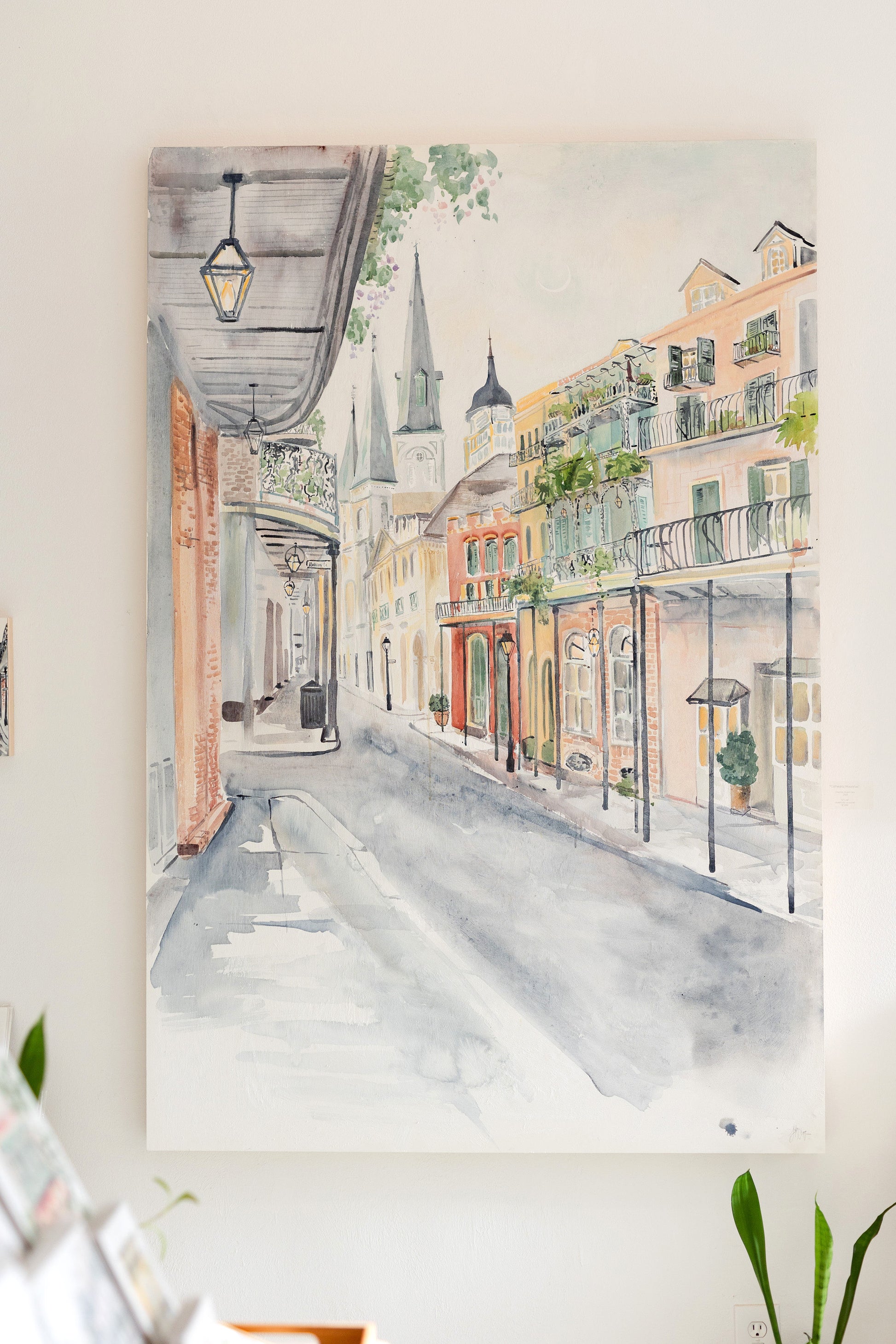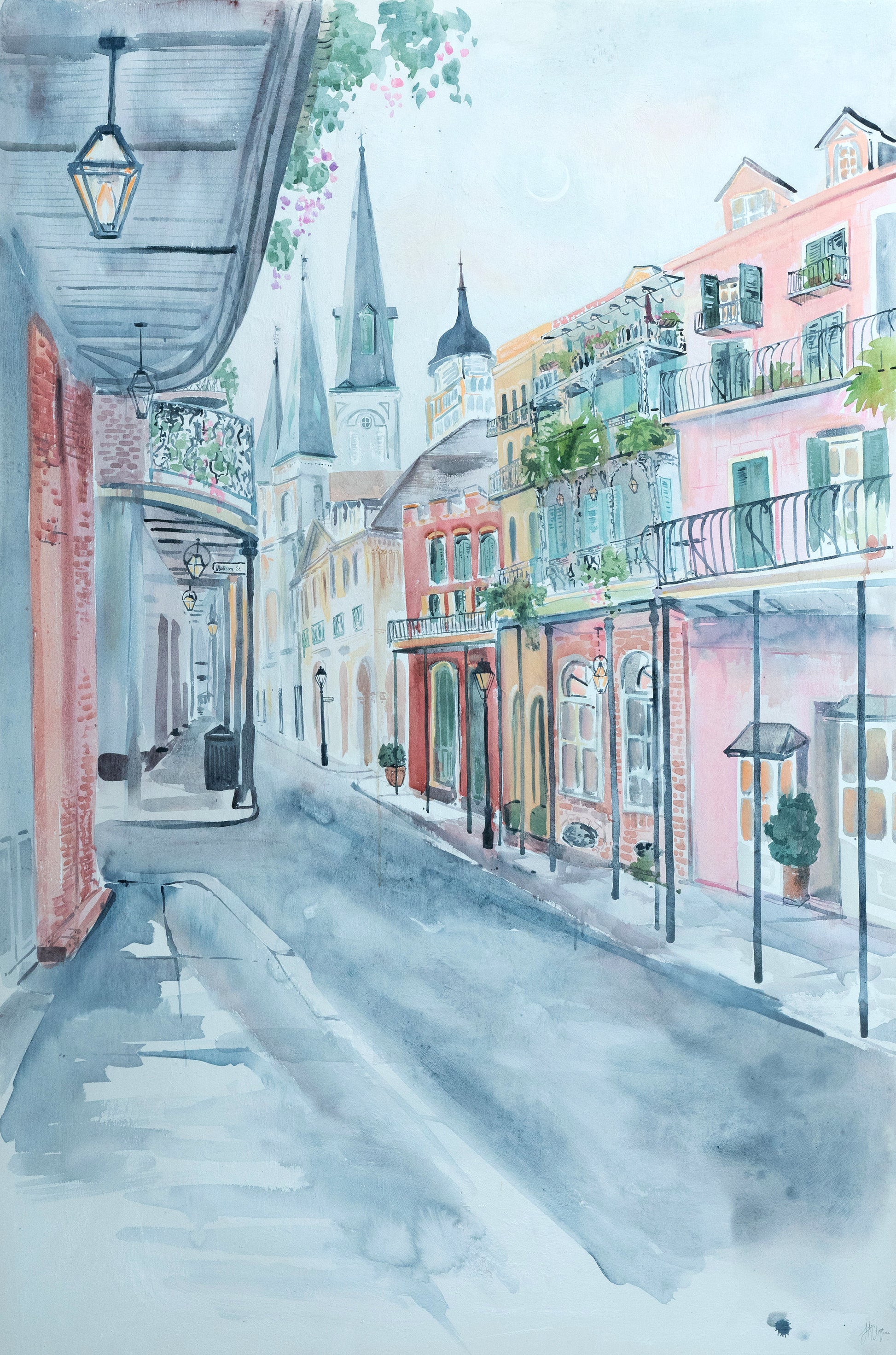 Standing in front of this painting feels like stepping into the French Quarter at twilight, walking towards the Cathedral. A sliver of a crescent moon hangs delicately in the sky.