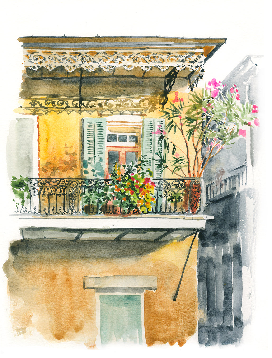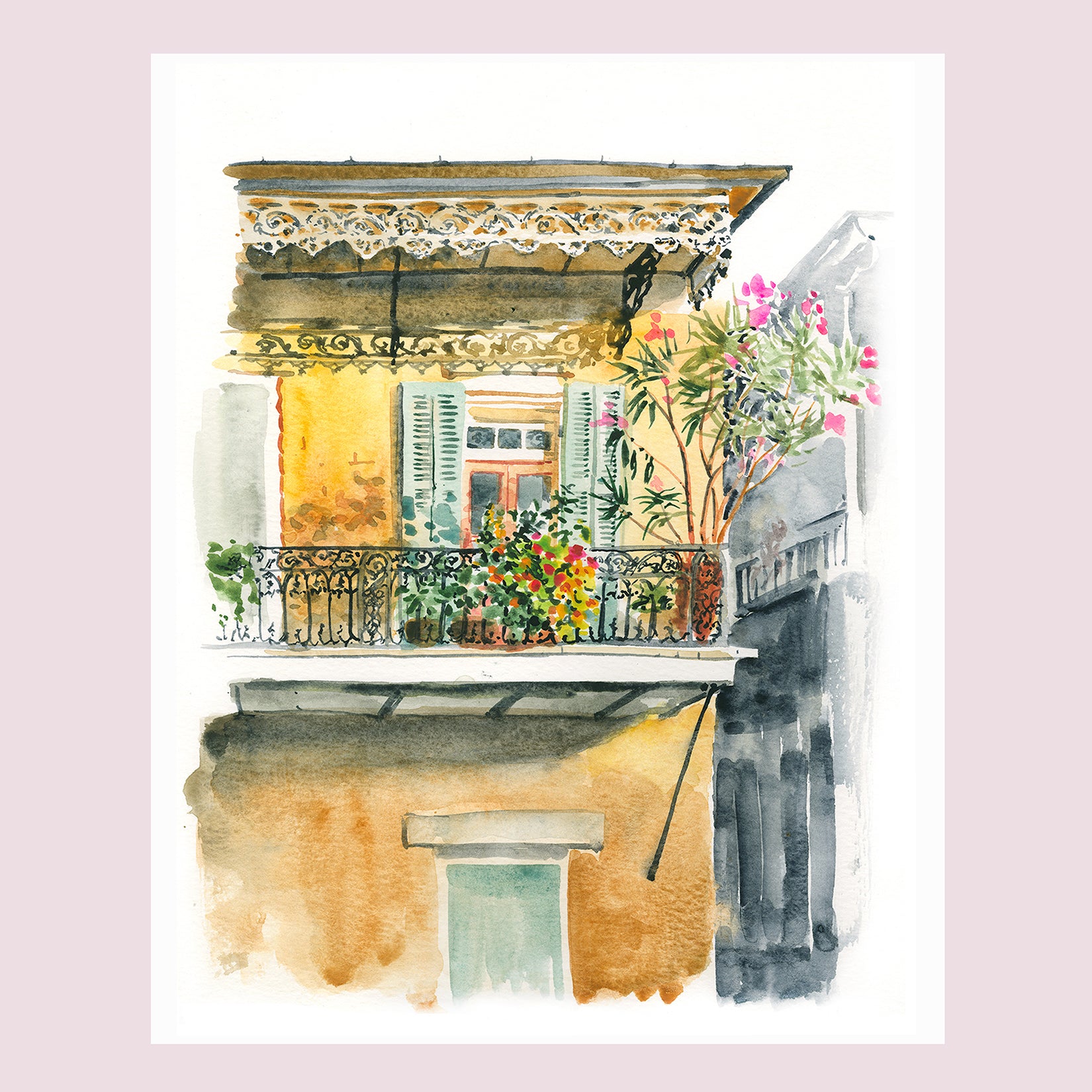 watercolor painting of a balcony at sunset in New Orleans
