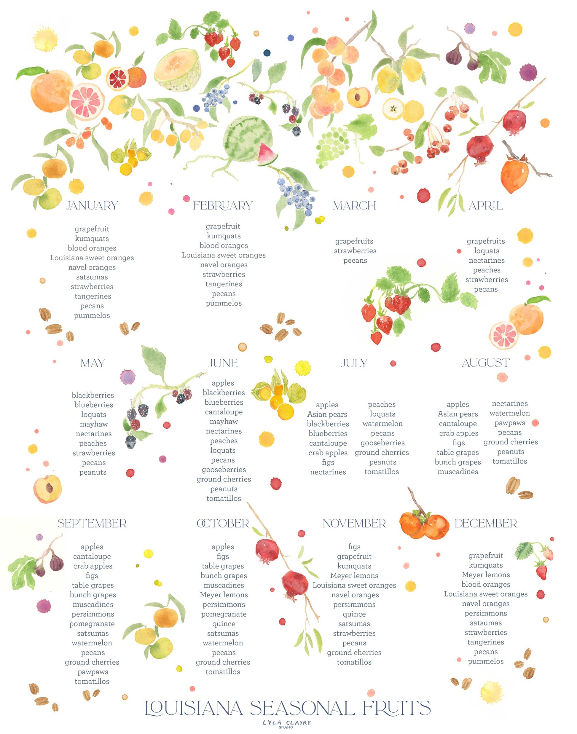 This fruit calendar shows you a month-to-month availability of Louisiana grown fruits. We hope you will hang this beautiful calendar in your home and use it to make your grocery and farmers market lists.