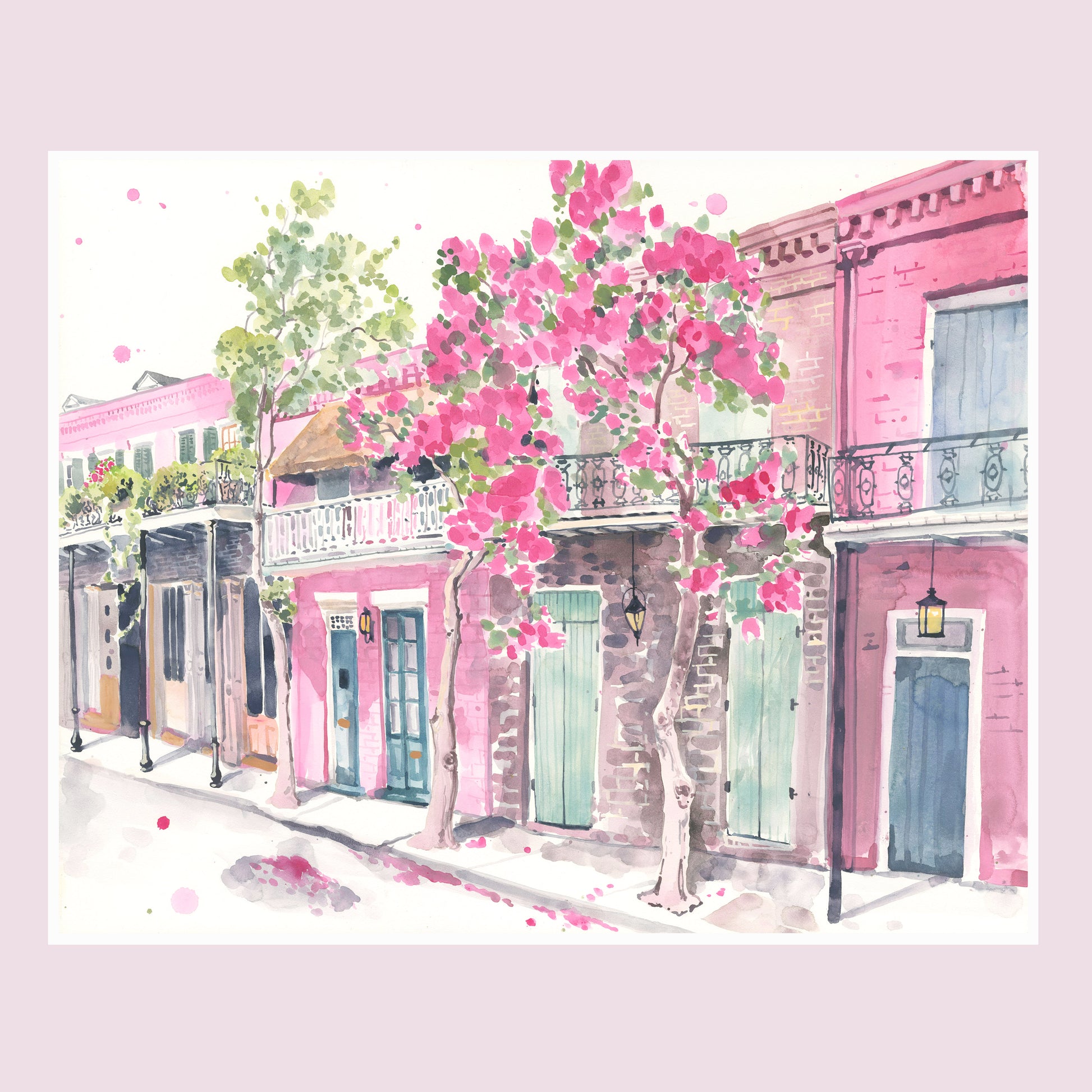 Scene on Chartres Street with pink crepe myrtle trees in full bloom, their petals filling the pothole