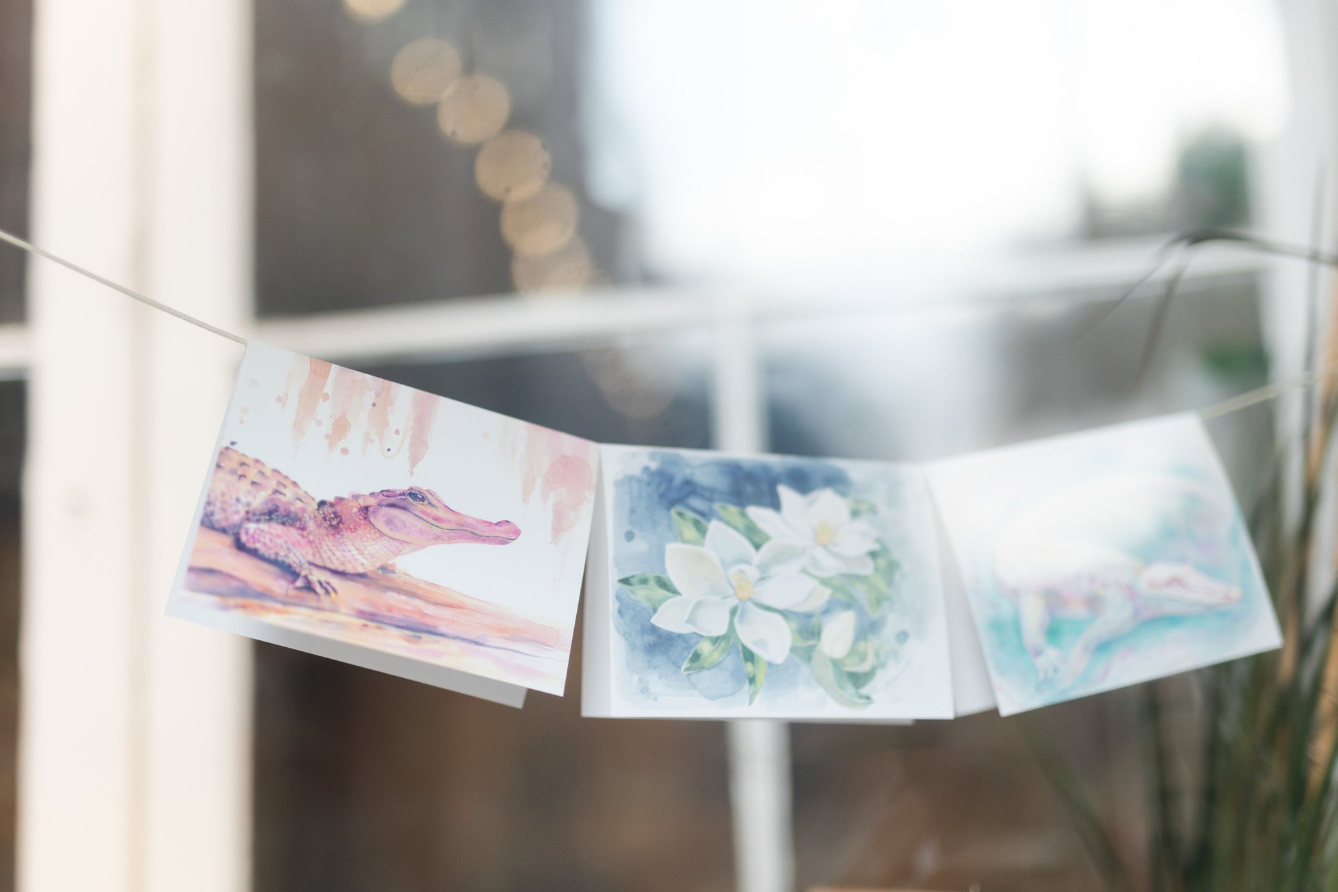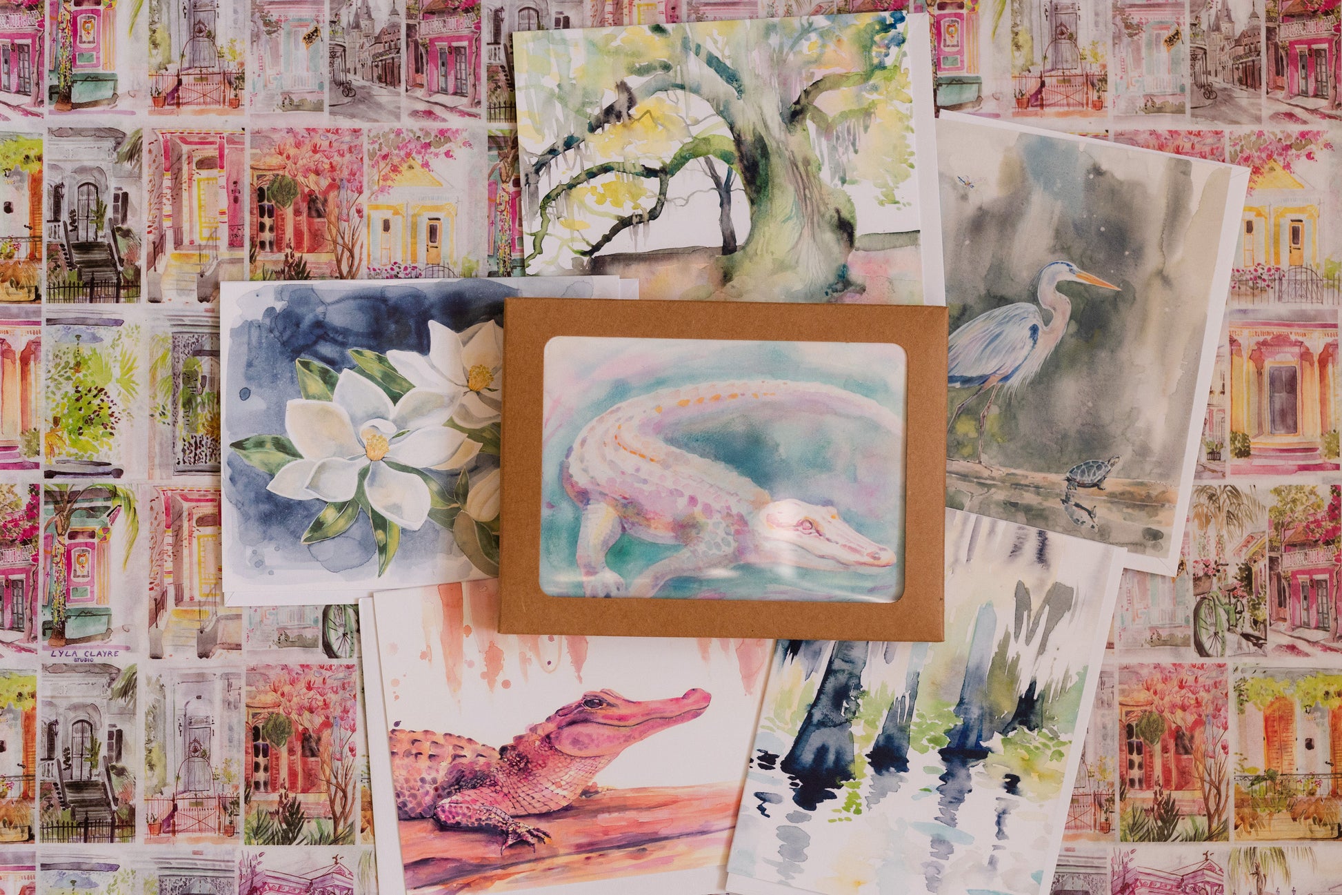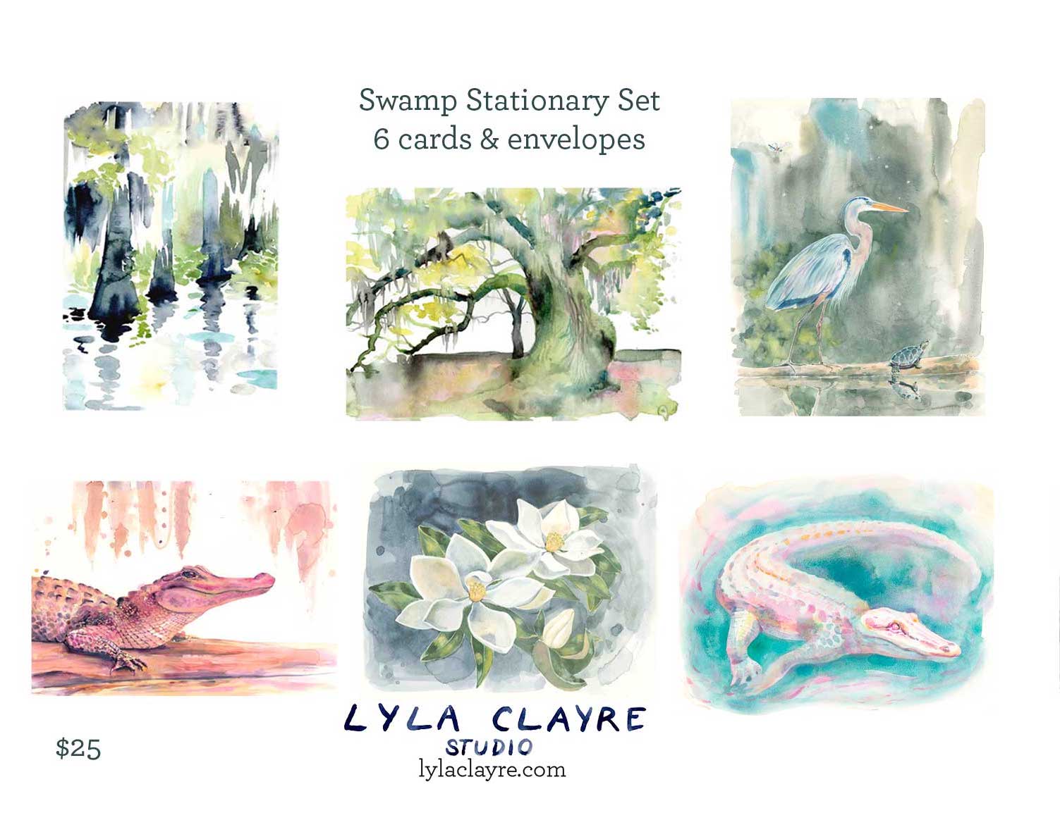 Assorted set of 6 folded notecards featuring swamp animals and landscapes